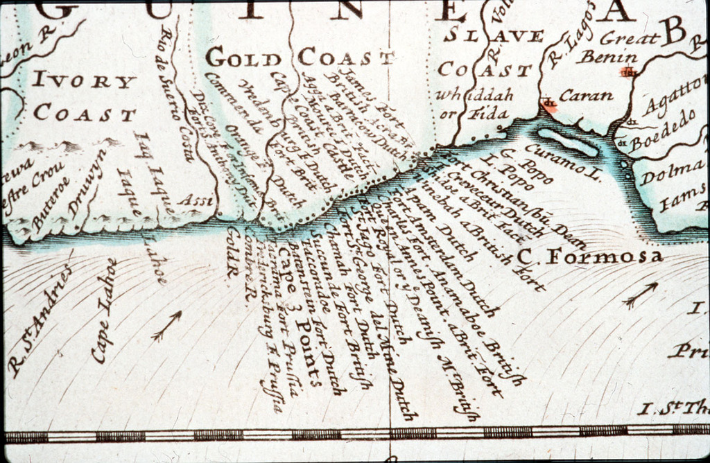 Ivory Coast, G Gold Coast, Slave Coast - Old map of the Slave Traders, including fortifications.